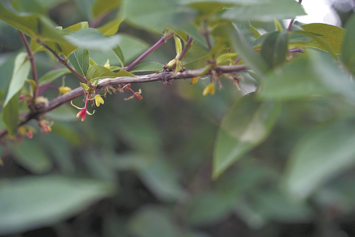 一路上,王康馆长提醒记者注意几株乍看平平无奇的树,离近了看,能发现绿叶间红豆大小鲜红的小果,两个一组,一边紧贴,一边分开,呈现对称的心形。稍离远点看,枝头挂着一颗颗小红心,这便是5月结出的郁香忍冬的果实。这种心形的浆果因为酸甜可口,果皮吹弹可破,也被叫做“爱心果”。