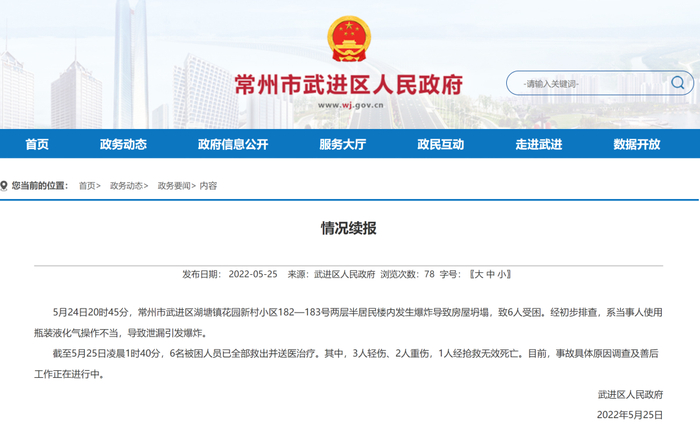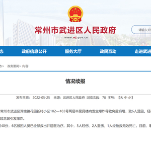 据江苏省常州市武进区人民政府网站消息,截至5月25日凌晨1时40分,常州市武进区湖塘镇花园新村小区居民楼爆炸事故6名被困人员已全部救出并送医治疗,其中,3人轻伤、2人重伤,1人经抢救无效死亡。