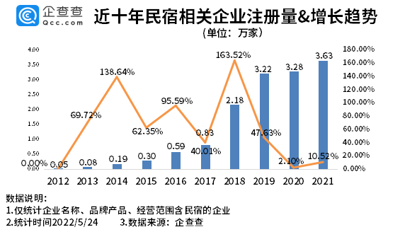 其中,2019年我国新增民宿相关企业3.22万家,同比增长47.63%。2020年新增3.28万家,同比增长2.10%。2021年新增3.63万家,同比增长10.52%。