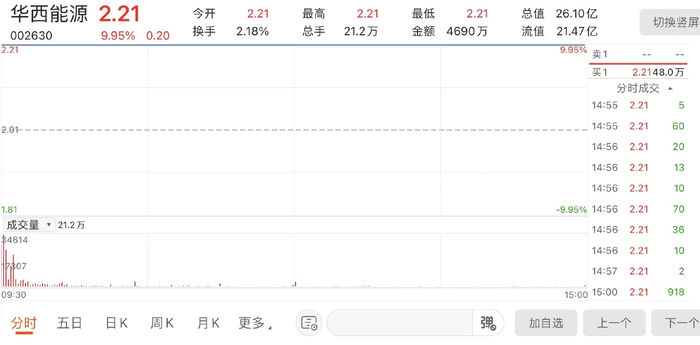 受上述消息影响,5月25日,华西能源一字涨停,报2.21元/股,总市值26.1亿元。