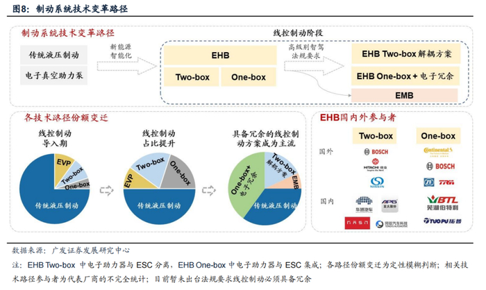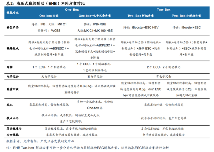 2.2 线控制动技术发展路径探讨:EHB Two-box解耦方案、EHB One-box+电子冗余方案、有冗余的EMB方案并存