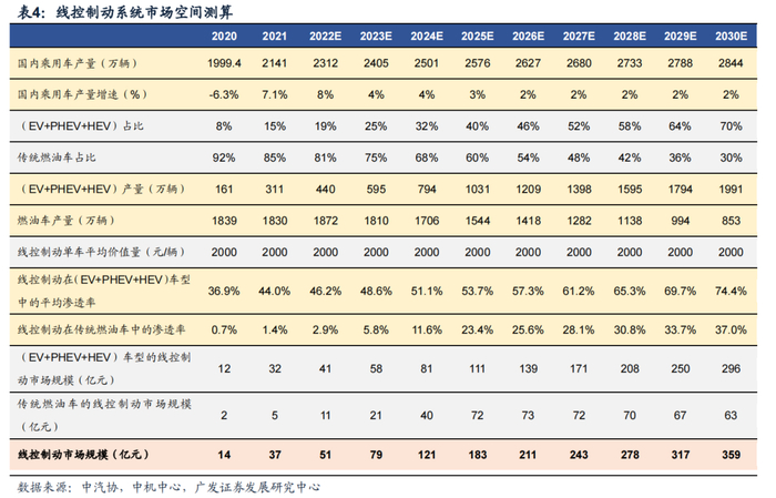 (6)线控油门渗透率:单车价值量150元;预计维持目前100%的渗透率。