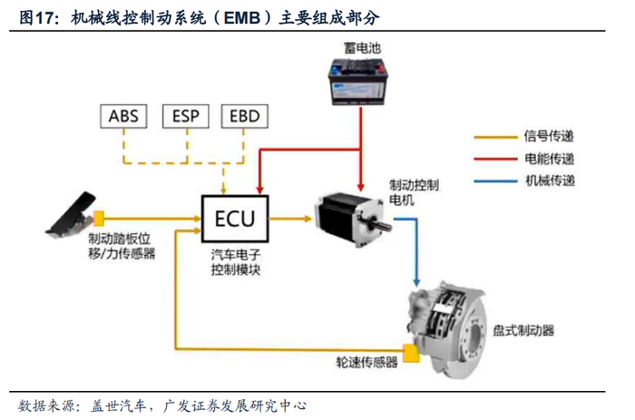机械式线控制动系统(EMB)完全摒弃了传统液压装置,采用电机直接给刹车碟施加制动力。EMB包括制动执行机构、电子控制单元、中心控制单元、制动踏板模拟机构、传感器和电源等主要组成部分。EMB具有响应速度极快、质量轻,集成度高的优势。但目前其技术成熟度不够高,综合成本较EHB方案较高,对底盘改造大,短期内难以在乘用车中实现大批量量产装车。