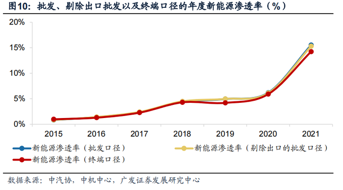 新能源乘用车渗透率加速提升。根据中汽协和中机中心的统计数据,2015年起新能源渗透率呈现逐年提升态势,2021年全年新能源乘用车批发口径、批发口径(剔除出口)、终端口径渗透率同比显著提升: