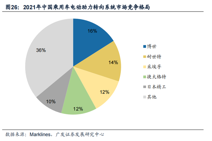 根据智研咨询,2019年中国乘用车EPS渗透率已达到86.5%,电动助力转向系统(EPS)是目前乘用车转向系统的主流方案。其中,R-EPS和DP-EPS由于助力效率更高,渗透率逐步提升。根据Marklines,2021年中国乘用车电动助力转向系统的份额较为集中,主要参与者包括博世、耐世特、采埃孚等。