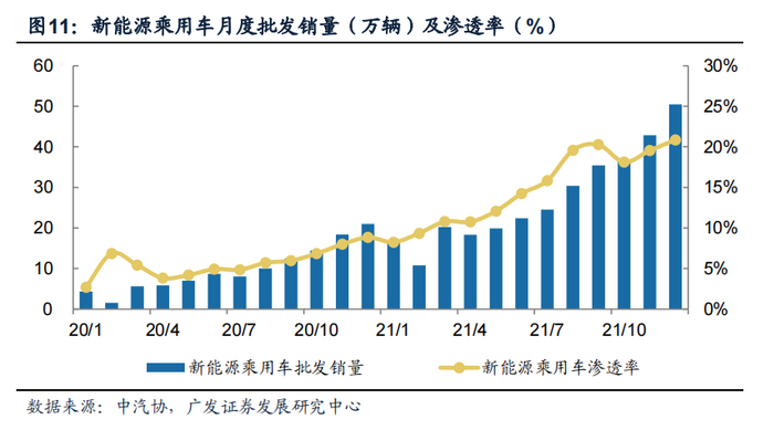 根据中汽协,2021年新能源乘用车累计销量达331.2万辆,同比增长181.0%;批发口径新能源乘用车渗透率为15.5%,同比增长9.3pct;