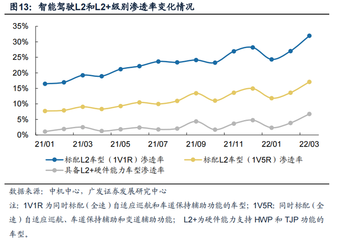 乘用车标配L2功能车型渗透率持续提升,智能驾驶升级提速。根据中机中心,标配L2功能(1V1R)的乘用车2022年3月终端销量渗透率提升至31.9%,同比增长12.7pct,渗透率加速趋势显著。此外,硬件能力支持L2+功能的车型终端销量渗透率2022年3月为6.8%,同比增长4.3pct,智能驾驶逐渐向高级别进阶。