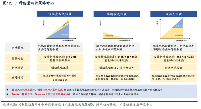 第二,线控制动助力实现协调式回收,能够满足新能源汽车不断提升的能量回收需求(续航)。传统燃油车依靠摩擦力消耗车辆动能进行制动,将动能转化为热能耗散,但在“每一公里都珍贵”的新能源汽车中,制动能量回收是提升续航里程的重要手段。传统液压制动系统踏板位移与制动力传导耦合,踩下制动踏板时,电机回馈制动与摩擦制动同时作用,只能实现叠加式回收,能量回收效率较低。线控制动踏板力与制动力解耦,优先电机回馈制动,制动力不够时摩擦制动才介入,可以实现协调式回收,能量回收效率高,有效提升续航里程。