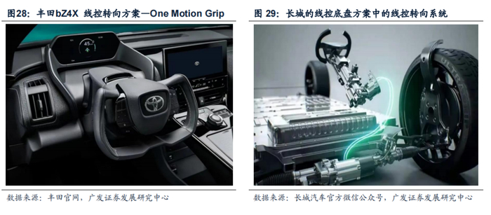 2021年4月上海车展丰田首发了由丰田与Subaru共同研发的“TOYOTA bZ4X CONCEPT”概念车,搭载线控转向系统;2021年10月,量产版的bZ4X也正式发布,将于2022年年中上市,可选装线控转向系统。2021年7月,长城汽车公开“智慧线控底盘”技术方案,线控底盘技术方案中包含线控转向,宣布在2023年正式投入商用,预计2025年前装渗透率达到40%。目前,各大主流车企加速线控转向布局,线控转向的量产搭载或将提速。