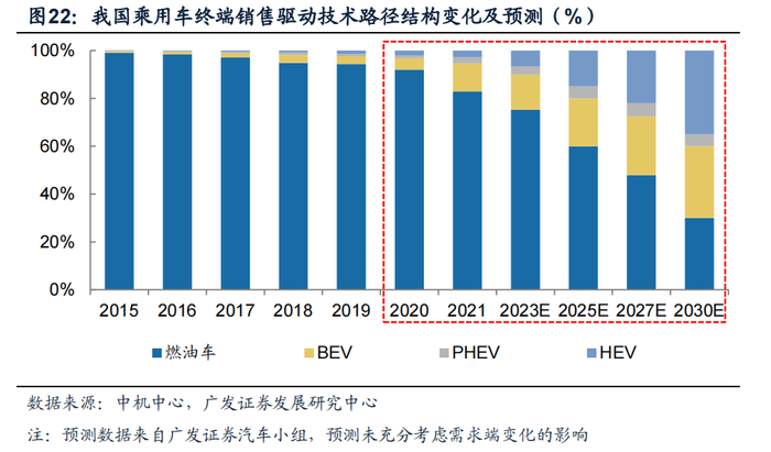 (2)乘用车驱动技术路径变化及预测:在面临法规约束和消费升级的背景下,混动化、电动化是车企平衡法规与需求下的最优解,我们预计高压混动和纯电动的市场份额将加速上行。预计2026年EV+PHEV+HEV占比为46%,2030年占比为70%;预计2026年传统燃油车占比为54%,2030年占比为30%。