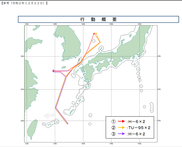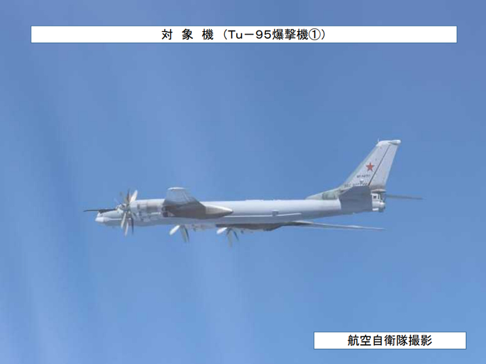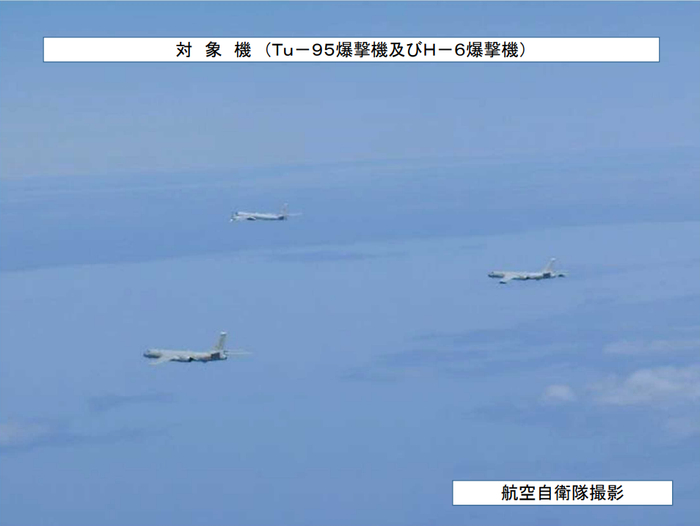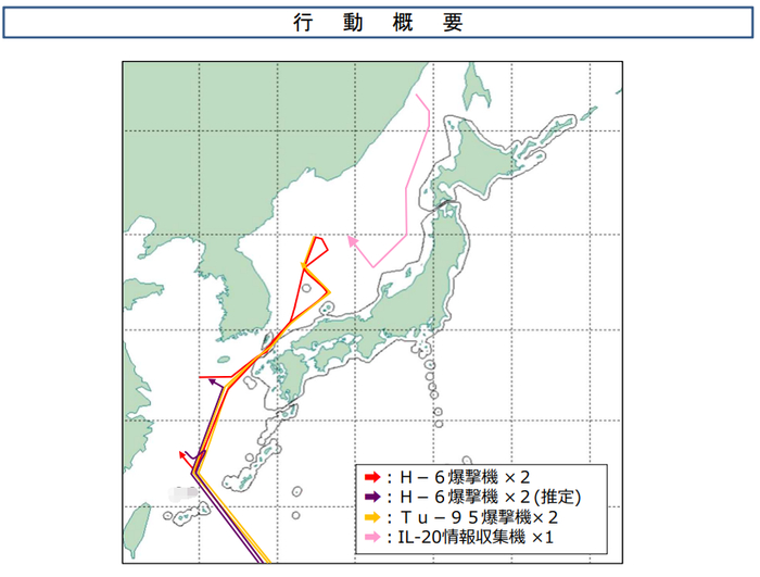 据日本防卫省统合幕僚监部24日发布的通报,当天的行动中俄共出动了4架轰炸机,中方两架轰-6,俄方两架图-95。此外,俄方还出动了一架伊尔-20侦察机。