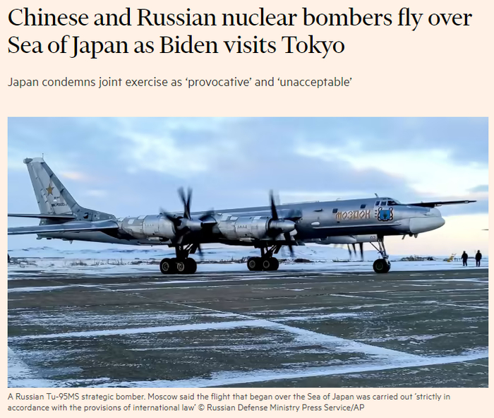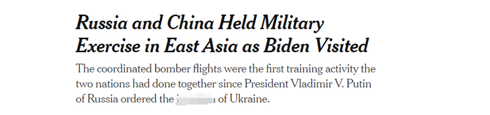 美国《纽约时报》文章的标题为“俄中在拜登访问之际在东亚举行军事演习”。报道强调,这是俄乌冲突以来中俄举行的首次联合军事演习,而在拜登访问该地区之际,中俄派出轰炸机飞越东北亚海域显然是在展示武力。