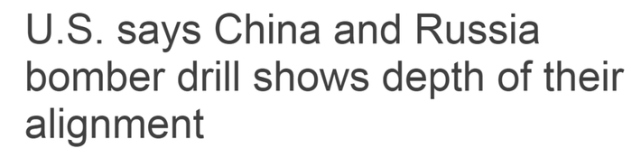 路透社文章的标题是“美国称中俄轰炸机演习显示了他们的‘结盟’的深度”,还配发了一张之前普京访华时,解放军仪仗队整理俄罗斯国旗的照片。