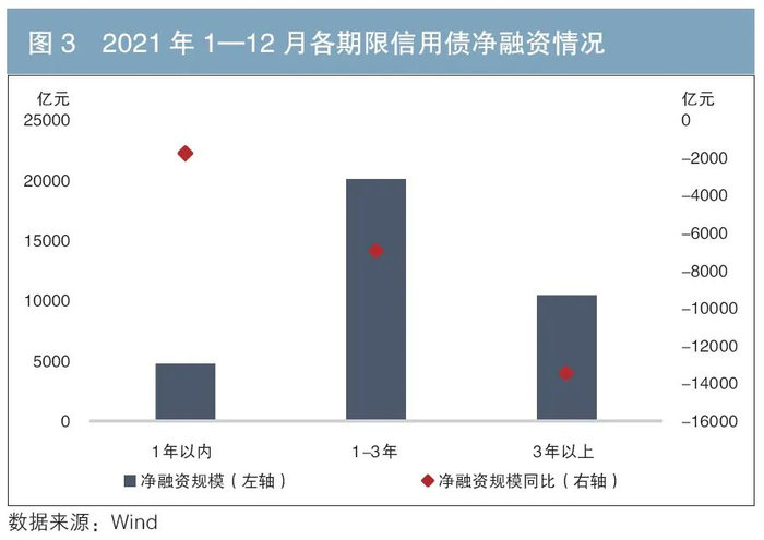 从发行期限来看,自2020年以来,短期限的信用债在全部信用债中的发行规模占比不断提高。2021年1—12月,1年期以内的信用债发行规模占比为38.81%,1~3年期的信用债发行规模占比为31.58%,两者合计占比较2020年上升1.83个百分点。此外,各期限信用债净融资情况也可以提供佐证。在永煤违约事件后,信用债市场情绪跌至“冰点”,虽然在央行货币政策支持下,市场情绪逐步得到修复,但2021年上半年仍是紧信用环境,下半年虽然政策端“稳增长”诉求有所抬升,宽信用预期升温,但仍然未见明显的政策效果落地,2021年信用债整体净融资额仅为3.63万亿元,较2020年同期减少超过三分之一。其中,3年期以上的信用债净融资额较2020年同期缩水近1.35亿元,减少幅度显著高于1年期以内和1~3年期品种(见图3)。