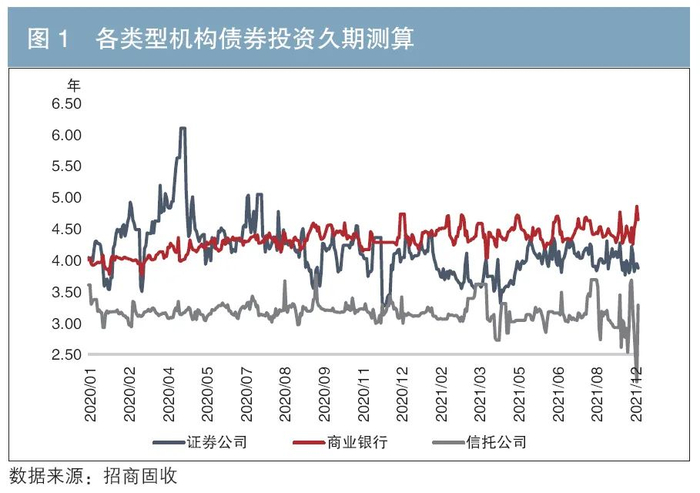 一是机构直接参与债券交易的久期始终处于低位震荡,短久期防守型策略贯穿2021年全年。根据招商证券固定收益研究团队关于久期的测算,2021年主要机构的债券投资久期均在震荡徘徊,未有明显抬升迹象,其中证券公司、保险公司的久期中枢有所下移(见图1)。具体来看,2021年1—12月,商业银行的债券投资久期呈现窄幅震荡,久期中位数为4.40年,较2020年小幅增加0.13年,变动幅度较小;证券公司的债券投资久期整体略低于商业银行,在2021年下行趋势较为明显,久期中位数降至4.0年以下,为3.98年,较2020年下降0.31年;信托公司的债券投资久期则明显低于其他类型机构,久期中位数为3.12年,较2020年下降0.07年。另外,根据构建的久期模型测算,中长期纯债基金的久期中位数也一直在2.0~2.4年之间徘徊,相较于“期限配置或组合久期超过3年以上”的产品定义,可以看出中长期纯债基金对于债券投资是偏谨慎的,一直在采取偏防守的策略。