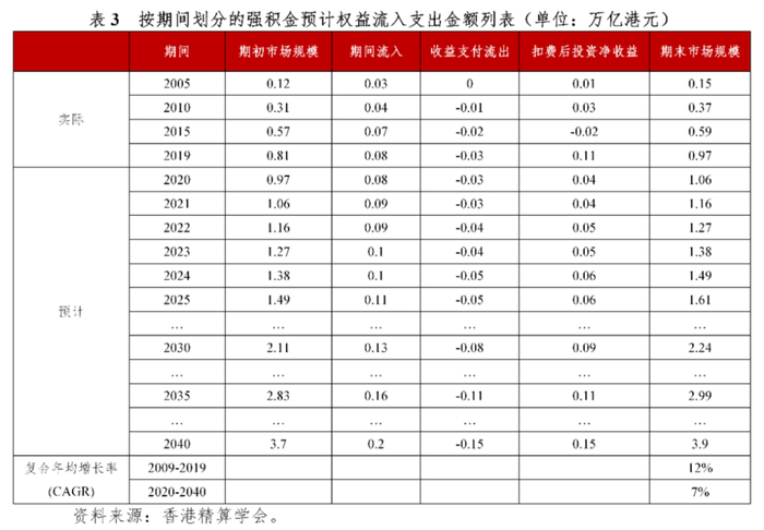 根据香港精算学会统计和预测,在未来20年间,强积金的期间流入规模均大于权益支付规模,负债端压力较小。