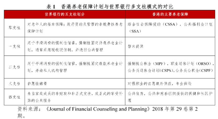 参照世界银行提出的五支柱养老保障体系,香港养老保障可对应分为零支柱、第二支柱、第三支柱及第四支柱,基本情况如下: