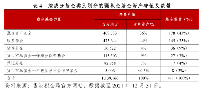 强积金制度的一个特点是有丰富的成分数量可供选择。截至2021年12月底,市场上共有411只成分基金。