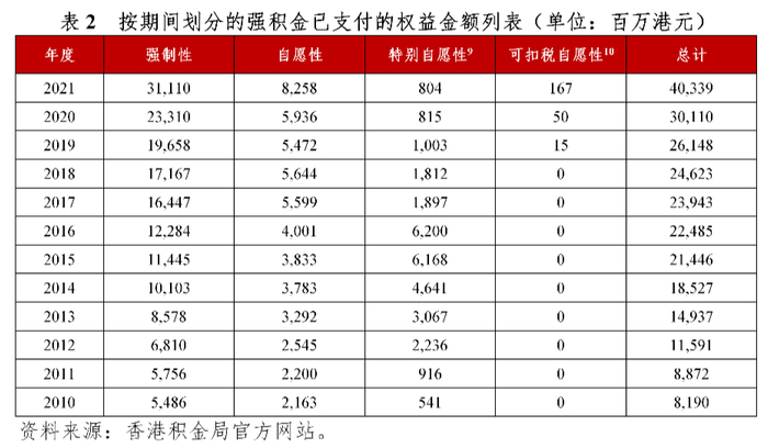 根据香港积金局统计,在2010至2021年间,强积金已支付的权益金额列表如下。