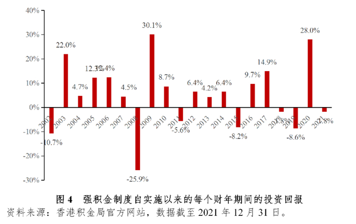 强积金制度自2001年成立以来,在过去20个完整财年期间[12],强积金在13个年度取得正回报,7个年度为负回报。值得注意的是,强积金虽在某些年份为负回报,但之后往往能够大幅反弹。以2002财年为例,继2002财年负回报后,强积金的投资回报在2003财年大幅反弹。这种下跌后回升的现象在2008财年、2011财年、2015财年和2019财年均有出现。
