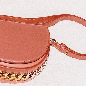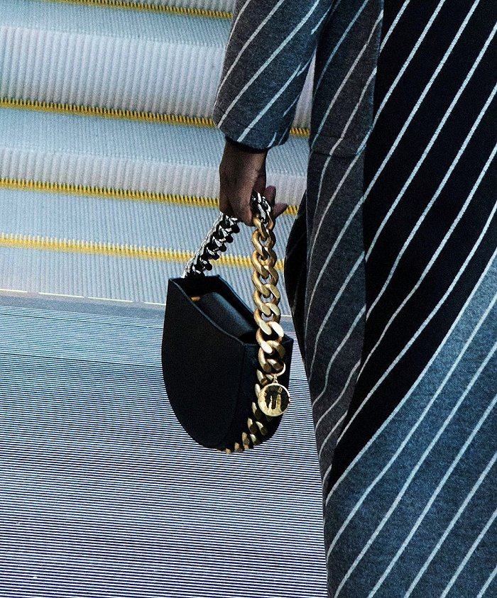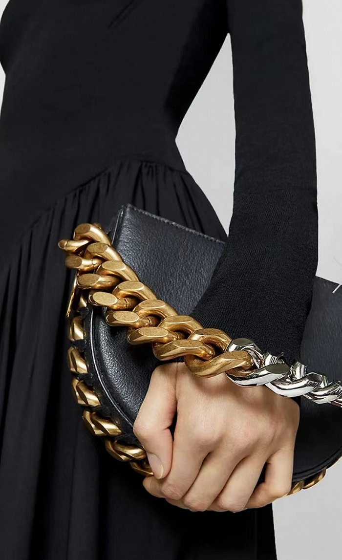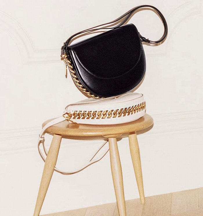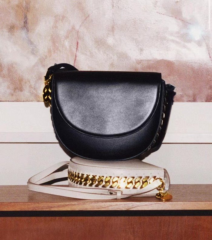 Frayme Mylo手袋除了具有开创性的材质特点,其半圆形的设计也十分沉稳难看,金,银两色拼接起来的粗链条展现时尚的优雅气质,而悬挂于链条上的品牌立体logo徽章如首饰般华丽而精致。据Stella McCartney,全新手袋Frayme Mylo预计于7月正式发售,限量100个。