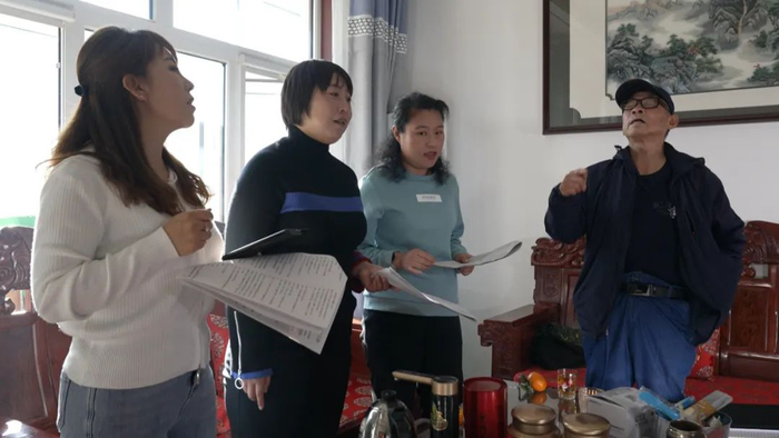 排练安排在每天下午5点半,地点就在古戏台西侧的一间屋子里。5点半,孔祥林准时进了屋,里面有七八个戏班“老人儿”已经就位,孔祥林问,还有谁没来?邱震宇说,再等等,还有两个没有确定,其中一个临时有事可能来不了。
