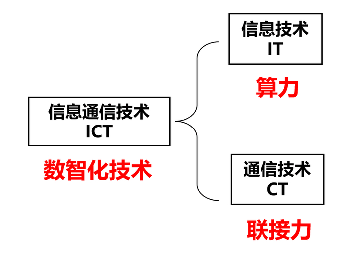 想要推动数智化转型,就离不开数智化技术的支撑。数智化技术的本质,就是信息通信技术,也就是现在常说的ICT。ICT技术由信息技术和通信技术组成,信息技术现在更流行的叫法,叫做算力。而通信技术,则被称之为联接力。