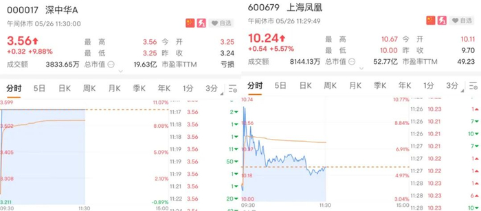 5月26日,深中华A、上海凤凰双双涨停,久祺股份、中路股份、钱江摩托等大幅冲高。