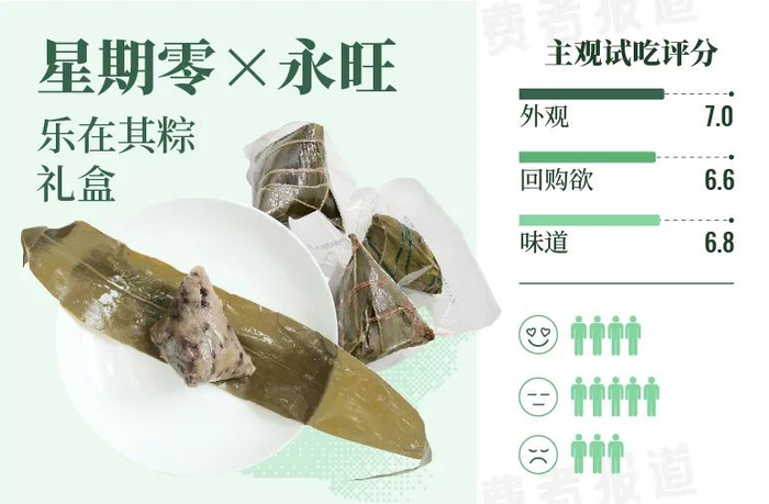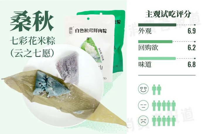 肉粽方面,试吃官大帝点评道粽子软糯可口,松而不散,分量还大,管饱,经典肉粽口味,有家里的味道;试吃官希洛表示糯米带有粽叶的淡淡清香,五花肉粽油脂丰富但不油腻,非常香口;试吃官粽子侠则表示部分馅料是混在粽米里面,个人觉得没有大块馅料的粽子只能称为饭团,还有外包装是荧光绿,有点丑。