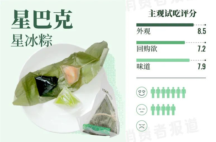 另外,这款雪冰粽也是这次主观试吃中最不像粽子的一款,与其说是粽子,不如说是一只伪装成粽子模样的冰淇淋。不过这可爱的外形也深得试吃官们的喜爱,外观评分高达8.8分。