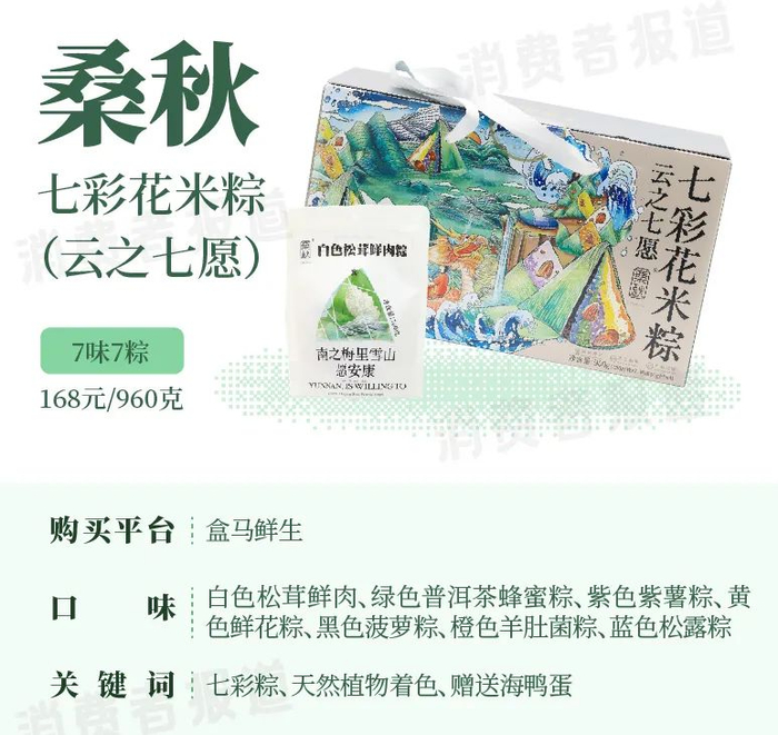 都说冷色系的食物会令人食欲大减,蓝色、紫色、绿色的粽子看着就让人不敢动筷。桑秋的这款七彩花米粽真的有点让试吃官们“瑟瑟发抖”。