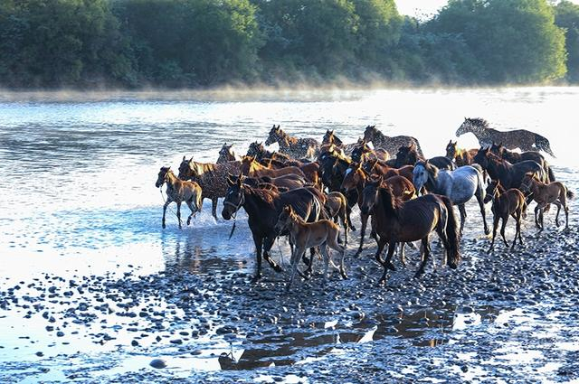 昭苏湿地晚霞中牧民饮马绝对唯美;早起拍摄朝霞映照的特克斯河晨雾,牛羊马群早起饮水的意境,绝对不辜负你的早起。