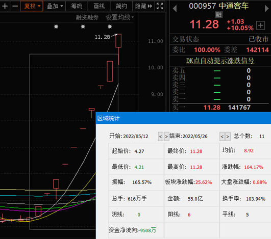 5月26日,中通客车继续强势上涨,午盘后大多数时间封在涨停板,截至收盘,封板买一单达141767手。该股自5月12日以来连续11日上涨,累计上涨164.17%,最近10个交易日更是连续拉涨停板。