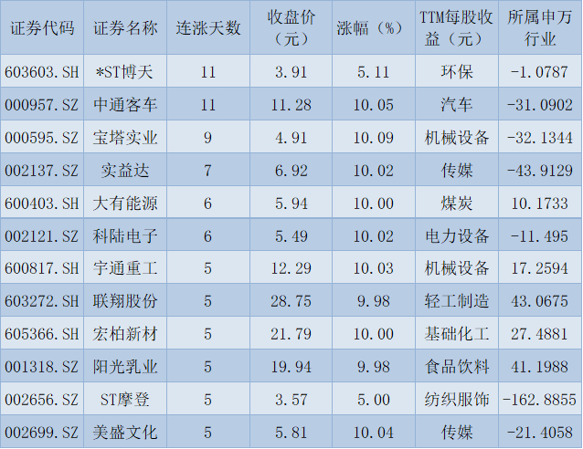表:连续上涨5天且今日收盘涨停股一览