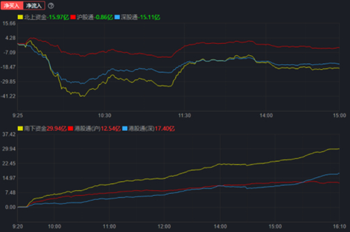 北向资金今日呈净流出态势,全天净买入-15.97亿元,其中,沪股通净买入-0.86亿元,深股通净买入-15.11亿元。