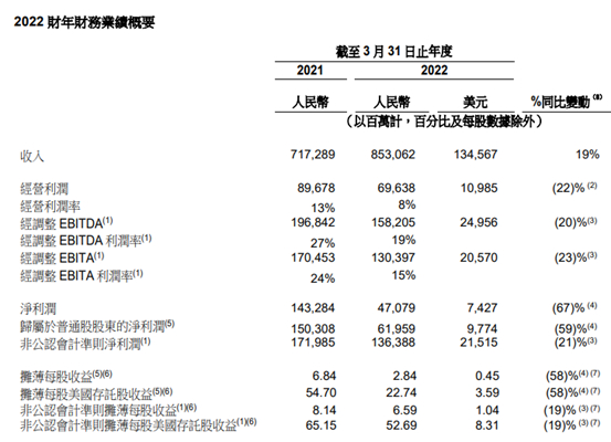 财报显示,2022财年阿里巴巴营收8,530.62亿元,同比增长19%。经营利润为人民币696.38亿元,同比下降22%。摊薄每股ADS收益为22.74元,摊薄每股收益为2.84元(0.45美元或3.50港元)。