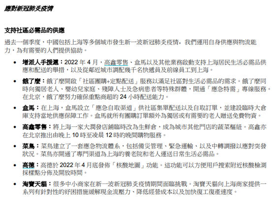 这包括,2022年4月,高鑫零售、盒马以及其他业务启动支持上海居民生活必需品供应和配送的举措,以及从邻近城市调配几千名快递员及前线员工到上海。饿了么开启“社区团购+定点配送”服务以满足社区对生活必需品的需求。饿了么同时向独居老人、婴幼儿家庭、残障人士及急病患者等特殊群体,开通应急特需专线服务。在北京,饿了么努力确保重点商超的24小时配送能力。在上海,盒马设立“应急自取渠道”供社区集单配送以及自取订单,并建设临时大仓库支持当地供应保障工作。盒马就所有团购订单额外为独居或有需要的老人赠送免费物资。