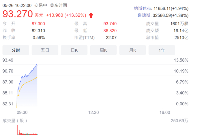 财报披露后,阿里巴巴美股大涨,截至发稿涨超13%,股价报93.27美元/股。