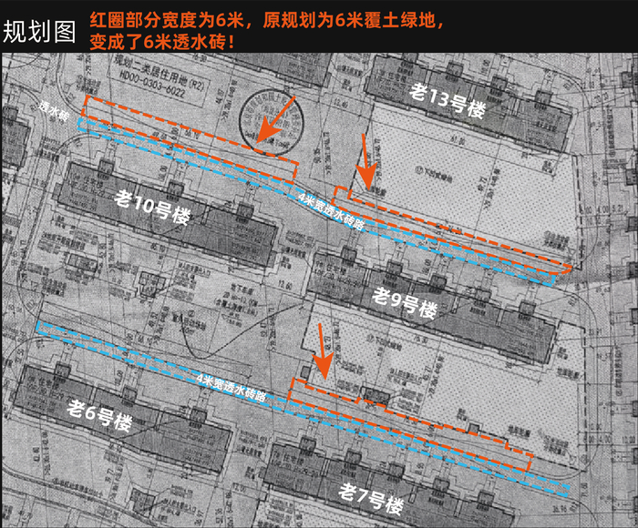那么,为什么覆土绿化面积的数据会出现如此大的出入呢?对此,紫郡兰园小区购房人又拿出了一份项目规划图纸进行了说明。“按照这份规划图,项目中原先规划的部分绿地已经变成了现在的透水砖。”赵晨表示,“即便是因为特殊原因需要更改原规划,那也要经过正规程序,至少得让购房人知悉。”