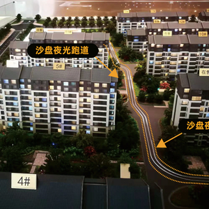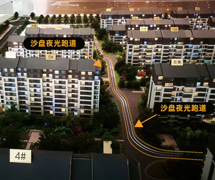 购房人称,其于2019年拍下的葛洲坝紫郡兰园项目沙盘中有夜光跑道(上图)。目前该小区中沙盘对应位置的实景(下图)。