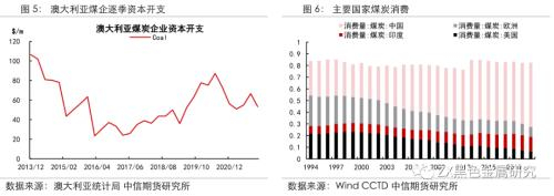 根据彭博及各国能源部门数据,我们发现海外煤企资本开支已经出现放缓的趋势,跟踪的主要煤企2020年资本开支较近十年历史高位均呈现不同程度缩减。国别方面,根据澳大利亚统计局数据,其资本开支趋势和中国相近,从2013年开始煤企资本开支逐步下降,虽2019年后有所增幅但整体开支中枢呈现下移,其结果带来的是澳煤产量近几年增幅甚微。美国从2011年开始,其煤炭行业逐步进入去产能周期,根据IEA数据,2019年美国煤炭产能9.18亿吨,同比-11%,可见去产能周期美国煤企资本开支也进入了放缓阶段。