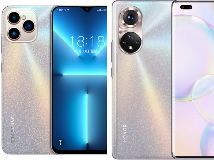 以销量1.3万件的朵唯D19 Pro为例,其直角边框设计、镜头和iPhone 13 Pro非常相似,海报显示,其背面品牌logo的位置、颜色、字体则与荣耀50 Pro一模一样。
