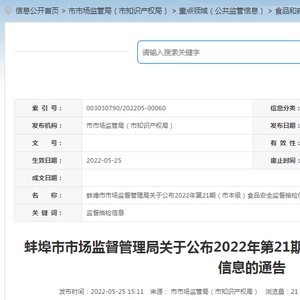 | 26 | 固镇县王庄镇金润万家超市 | 固镇县王庄镇育英路48号 | 固镇县王庄镇金润万家超市 | 安徽 | 卤鸭翅 | 散称 | 2022-02-17 | 肉制品 | 第二十一期 | 2022.05.25 | 蚌埠市市场监督管理局 | |
