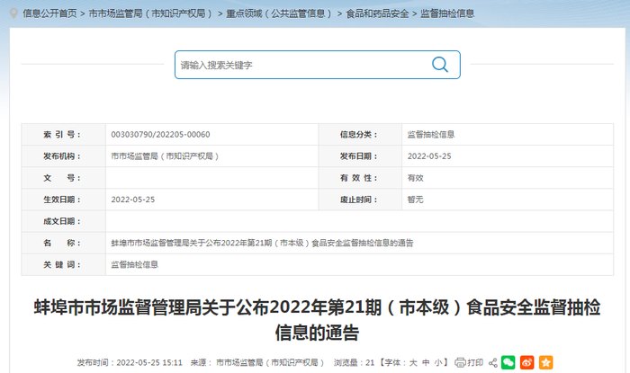 | 51 | 蚌埠市好爱吃食品有限公司 | 安徽省蚌埠市固镇县经济开发区纬六路南侧 | 蚌埠市好爱吃食品有限公司 | 安徽 | 劲辣烤脖 | 25克/袋 | 2022-03-04 | 肉制品 | 第二十一期 | 2022.05.25 | 蚌埠市市场监督管理局 | |