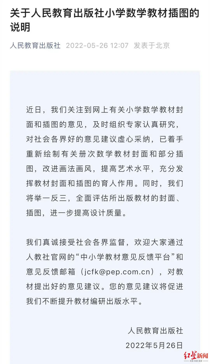 人教版数学教材里的插图遭到网友群嘲后,人民教育出版社发文回应称,已注意到网上有关小学数学教材封面和插图的意见,及时组织专家认真研究,对社会各界好的意见建议虚心采纳,已着手重新绘制有关册次数学教材封面和部分插图,改进画法画风,提高艺术水平,充分发挥教材封面和插图的育人作用。同时,将举一反三,全面评估所出版教材的封面、插图,进一步提高设计质量。