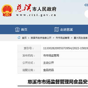 浙江省慈溪市市场监管局抽检食品98批次 合格率98.98%