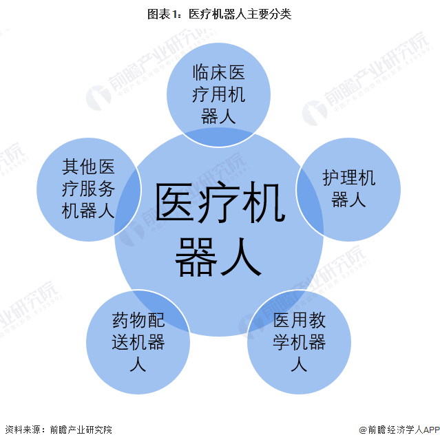 医疗机器人是在医院、诊所进行治疗或辅助治疗工作的机器人。医疗机器人的分类方式较多,按照其用途不同,主要可以分为临床医疗用机器人、护理机器人、医用教学机器人、药物配送机器人、其他医疗服务机器人等。
