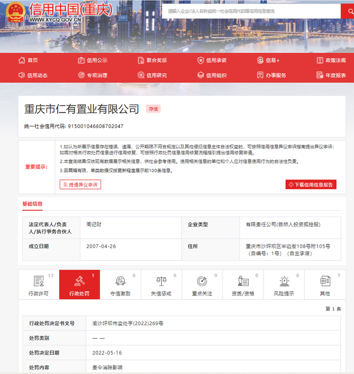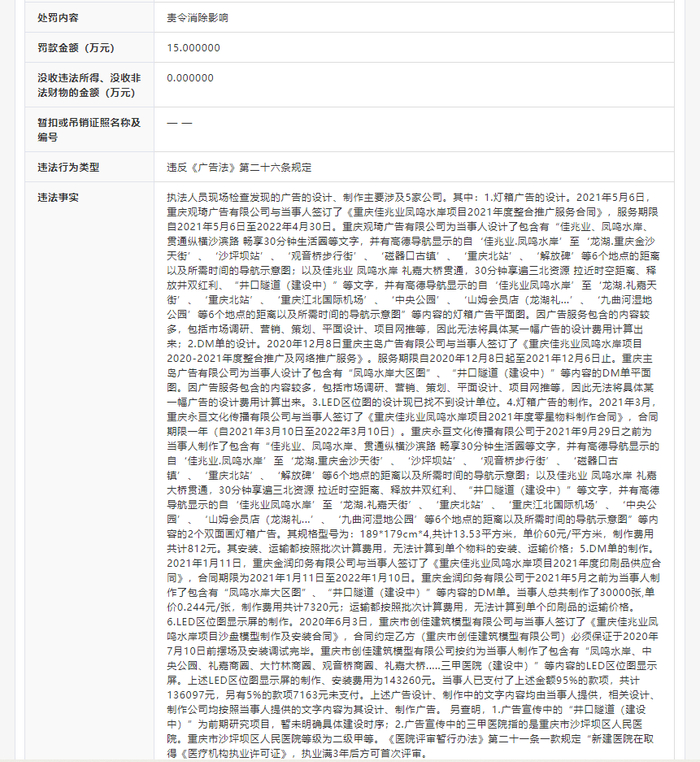 违法事实:渝沙坪坝市监处字(2022)269号信息显示,重庆仁有置业与5家广告公司分别签订了重庆佳兆业·凤鸣水岸项目相关宣传推广合同。