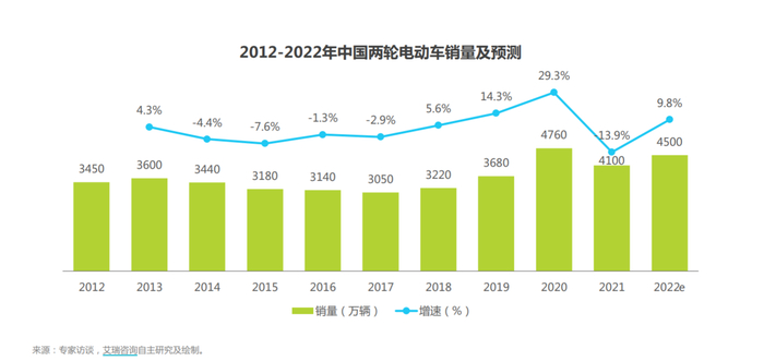 2022年,大量城市新国标过渡期结束,两轮电动车换购又将迎来一轮小高峰。艾瑞咨询报告预测,2022年中国两轮电动车累计销量将达到4500万辆,同比上升9.8%。