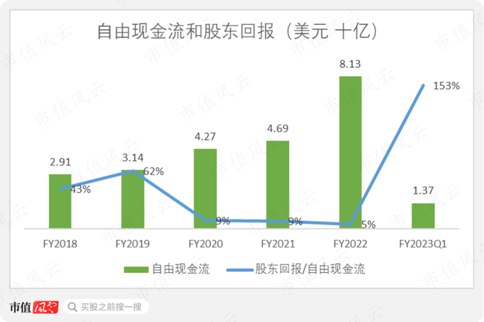 而在今年股价大幅下跌,以及19财年业绩预期很差的情况下,公司会拿出真金白银大笔回购。今年一季度,股息和股份回购合计21亿美元,占自由现金流的153%。